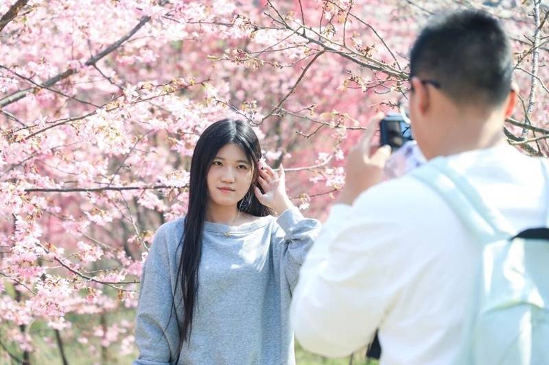 游客在樱花园中赏樱拍照。