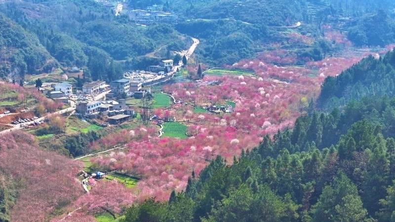 2月中下旬,观山湖区百花湖镇上麦城村的樱花已按捺不住春的召唤,悄然绽放枝头。粉白红相间的樱花缀满山间,与村寨、田园小径构成一幅灵动的春日画卷。